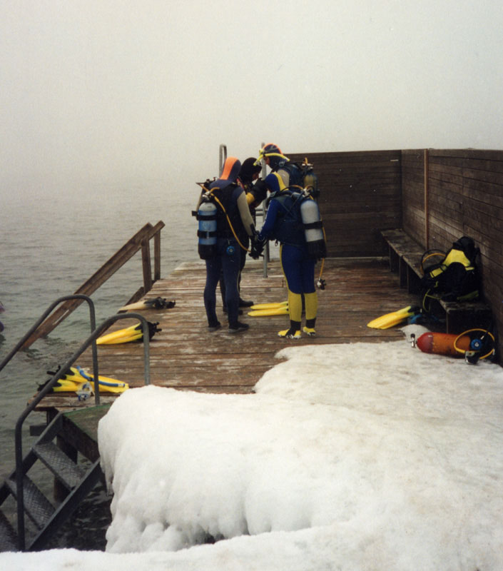 This is a dive site on the Attersee, a lake in upper austria. It was the year 1996 when I made my first step into the cold water. Air temperature -4°C, water temperature ranging from 0°C to 4°C. |